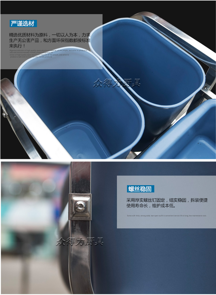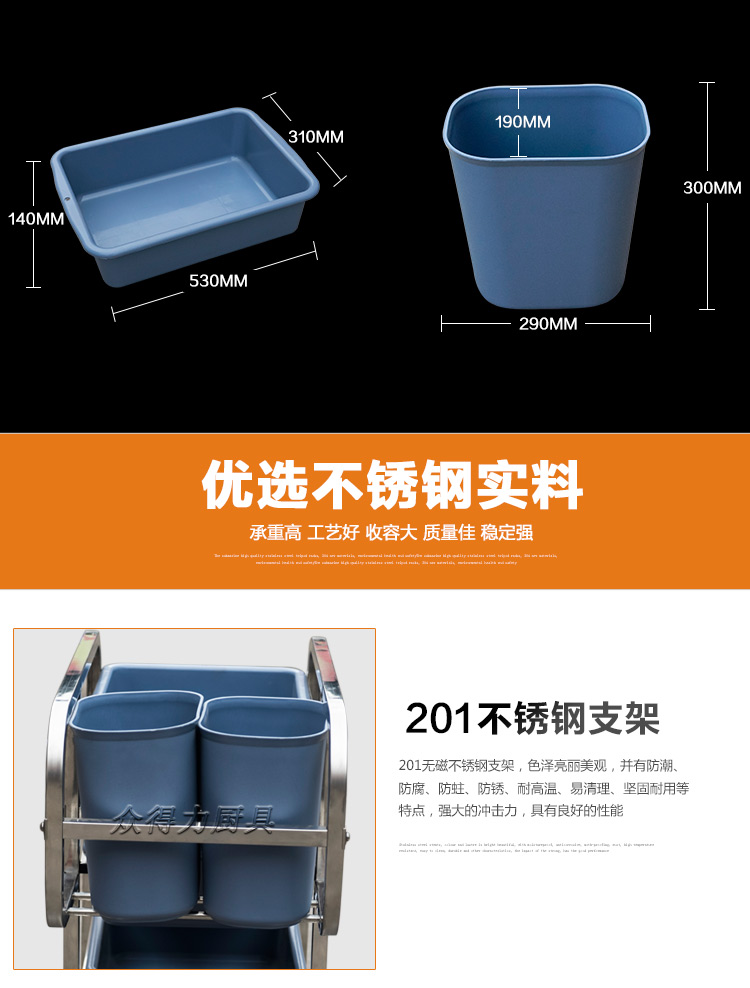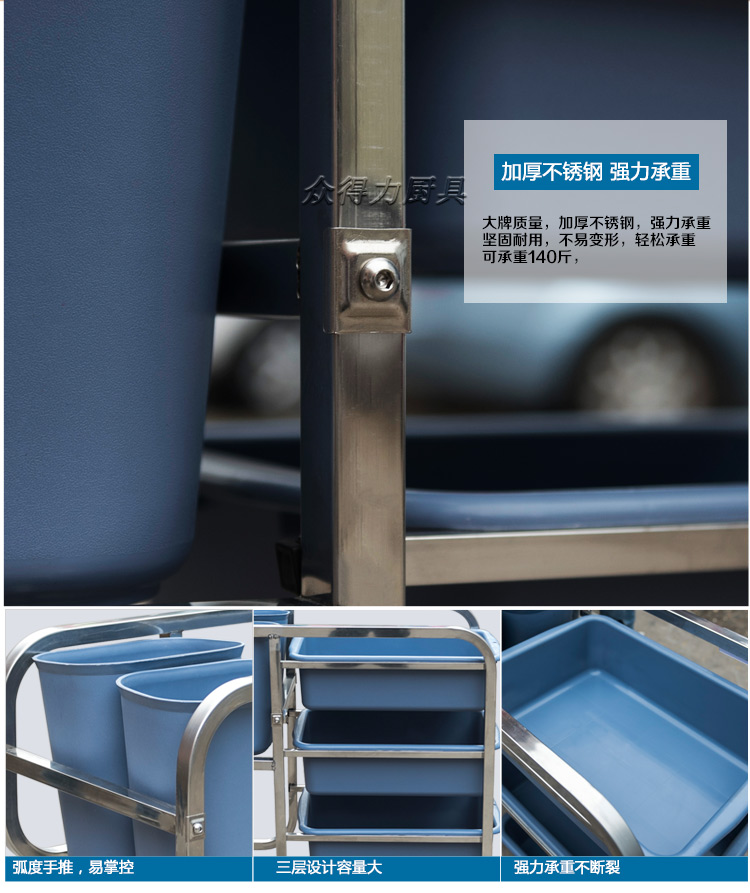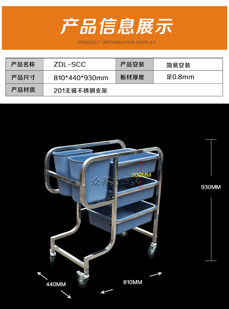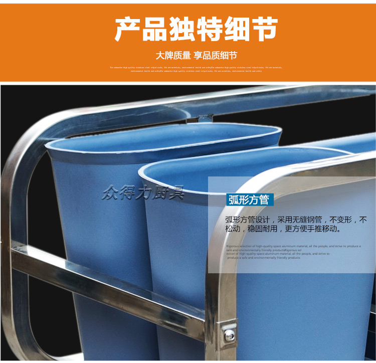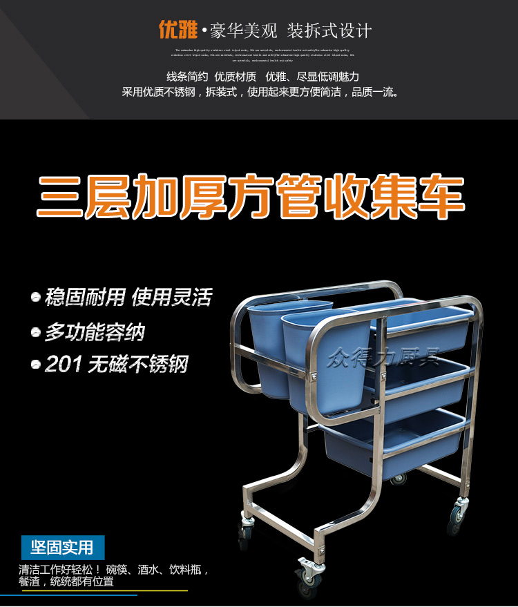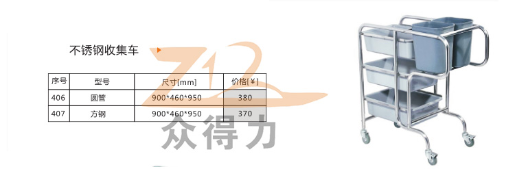 江西眾得力廚具有限公司生產銷售商用廚具,白鋼調理系列設備及食品機械,提供中央廚房工程項目整體解決方案。不銹鋼收集車有方管和圓管之分,組裝式,拆卸清洗方便,采用標配足0.8mm201無磁不銹鋼加工設計。外形美觀,設計精量,符合餐飲食品衛生需求。