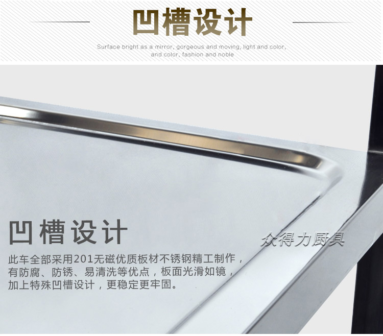 江西眾得力廚具有限公司生產銷售食品機械,商用廚具系列中央廚房設備,為客戶提供廚房整體解決方案。我司生產銷售的酒水車有大、中、小三種規格,采用201無磁不銹鋼設計。外形美觀大方,結實耐用。深受餐飲酒店客戶青睞
