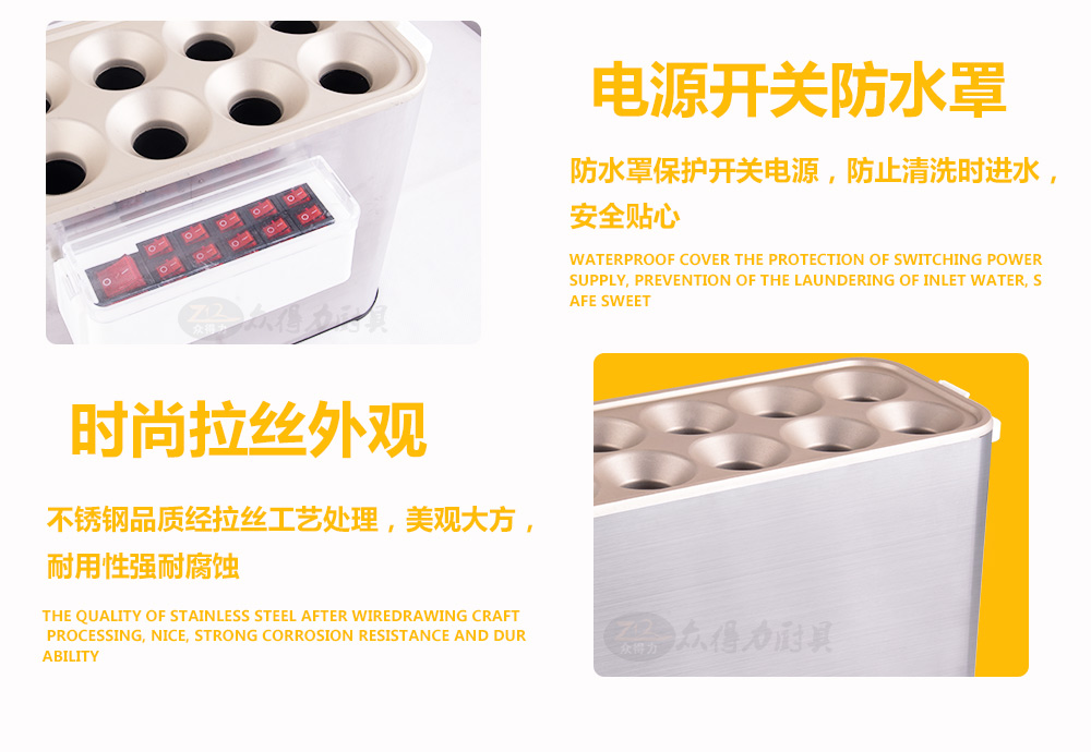 燃氣蛋腸機,電熱蛋腸機,快速升溫,360度環繞加熱,5分鐘即可做出鮮嫩的蛋腸,一次做十個蛋卷,平均每半分鐘即可烤熟一根,有效縮短等待時間,提高產品銷售額,蛋腸蛋卷美味吸引過往人群,小吃致富首選小設備,操作簡單。眾得力廚具,給我一個空間,服務一輩子。