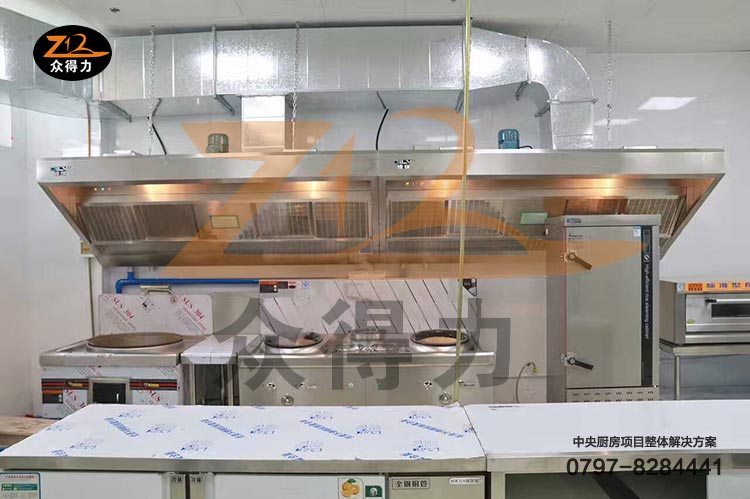 銀行餐飲部后廚效果圖展示,能供應一百人左右食堂廚房配備締綠油煙凈化一體機,電磁爐灶,蒸飯柜,湯爐、操作臺、打荷臺等系列產品。