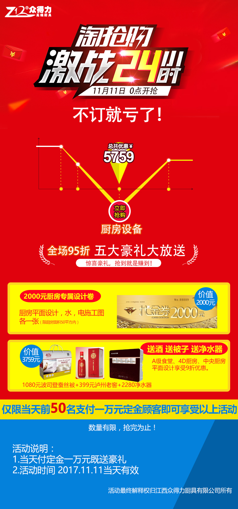 江西眾得力廚具有限公司雙11期間,舉辦訂廚房設(shè)備送豪禮活動(dòng),現(xiàn)場(chǎng)火爆,豪禮大放送,預(yù)付1萬(wàn)元廚房設(shè)備定金,獲5759元精美禮品大禮包